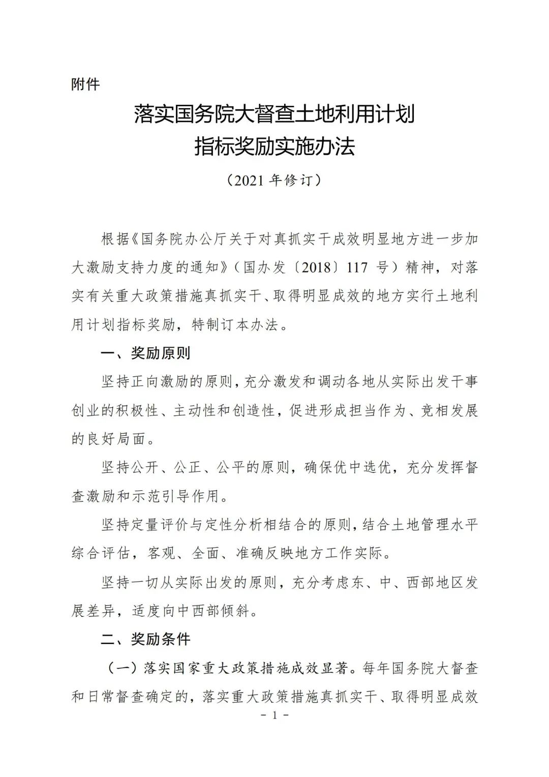 自然資源部辦公廳關(guān)于印發(fā)《落實國務(wù)院大督查土地利用計劃指標(biāo)獎勵實施辦法(2021年修訂)》的通知