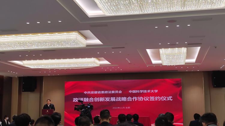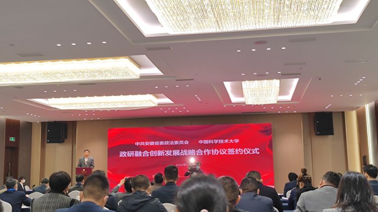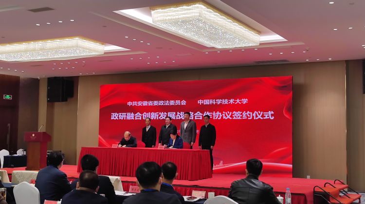 會上,在安徽省委常委、省委政法委書記張韻聲、中國科學(xué)技術(shù)大學(xué)黨委書記舒歌群的見證下,省政法委常務(wù)副書記張明和中國科學(xué)技術(shù)大學(xué)黨委常委、總會計師黃素芳分別代表安徽省委政法委和中國科學(xué)技術(shù)大學(xué)簽署了《關(guān)于政研融合創(chuàng)新發(fā)展的戰(zhàn)略合作協(xié)議》。