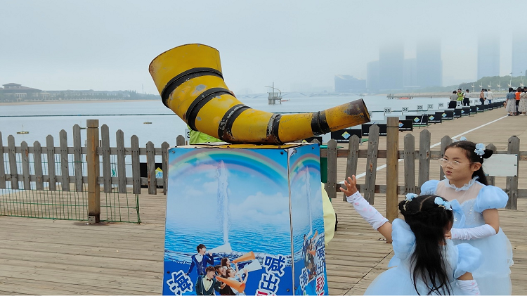 接著我們來到海上喊泉場地,伴隨著一聲中氣十足的吶喊聲,一注噴泉直沖云霄!