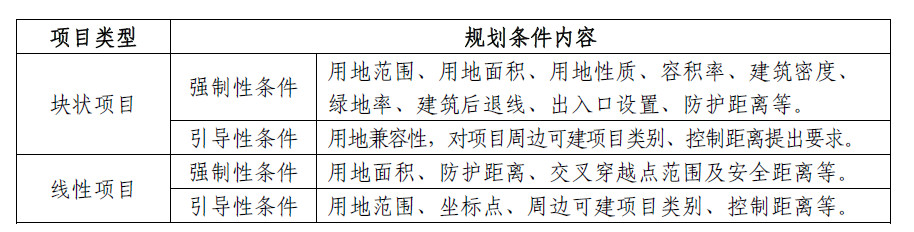 備注:強制性條件是指建設(shè)項目必須符合的規(guī)劃條件;引導(dǎo)性條件是指建設(shè)項目允許有選擇、可參考的規(guī)劃條件。