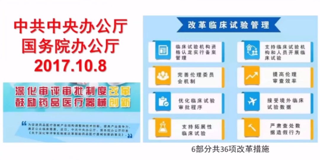 2017年10月8日,為鼓勵(lì)藥品醫(yī)療器械科技創(chuàng)新,提高上市產(chǎn)品質(zhì)量和產(chǎn)業(yè)競爭力,滿足公眾臨床需要,中共中央辦公廳、國務(wù)院辦公廳印發(fā)了《關(guān)于深化審評(píng)審批制度改革鼓勵(lì)藥品醫(yī)療器械創(chuàng)新的意見》。在多方面深化了審批制度,包括改革臨床試驗(yàn)管理、加快上市審評(píng)審批、促進(jìn)藥品創(chuàng)新和仿制藥發(fā)展、加強(qiáng)藥品醫(yī)療器械全生命周期管理、提升技術(shù)支撐能力、加強(qiáng)組織實(shí)施等。