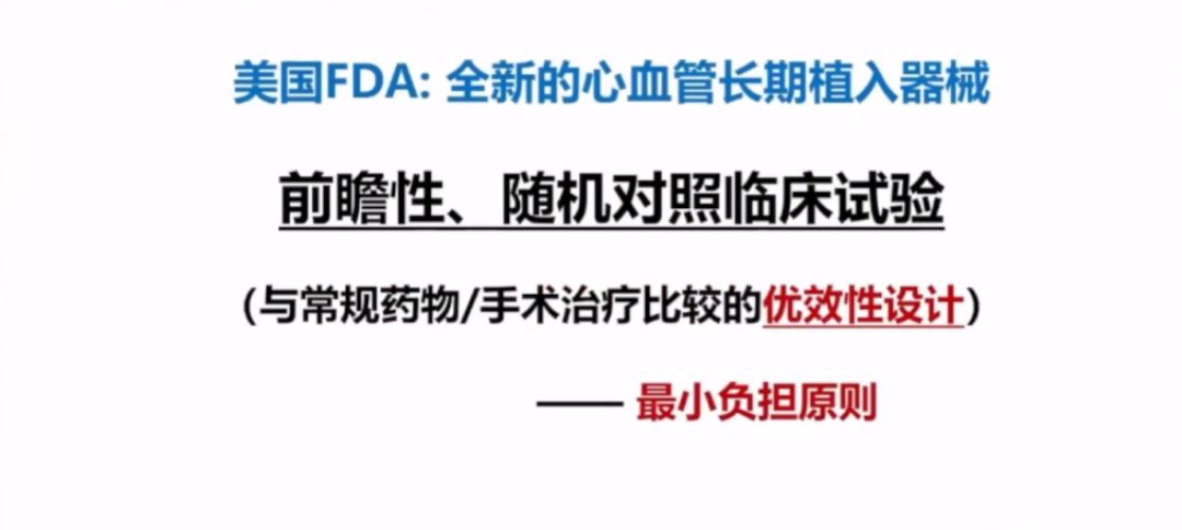 李衛(wèi)教授講到,美國FDA針對(duì)全新的心血管長期植入器械,也要做前瞻性、隨機(jī)對(duì)照臨床試驗(yàn)。創(chuàng)新產(chǎn)品無同類產(chǎn)品可對(duì)照,可與常規(guī)的藥物/手術(shù)治療比較的優(yōu)效性設(shè)計(jì),也就是最小負(fù)擔(dān)原則。
