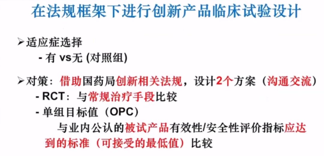在法規(guī)框架下進(jìn)行創(chuàng)新產(chǎn)品的臨床試驗(yàn)設(shè)計(jì),李教授認(rèn)為最關(guān)鍵的是適應(yīng)癥的選擇問題(有無對(duì)照組),可設(shè)計(jì)出2個(gè)方案,以便和國家藥監(jiān)局相關(guān)部門溝通。