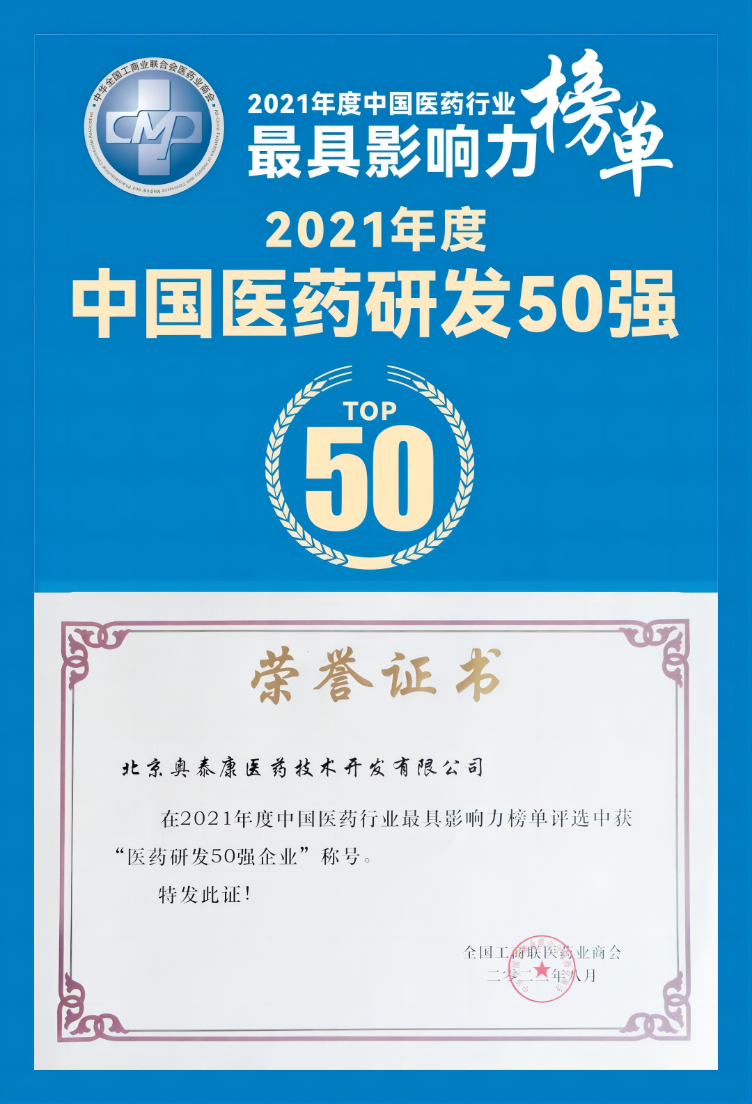 2023年3月25日-27日,全國(guó)工商聯(lián)醫(yī)藥業(yè)商會(huì)年度峰會(huì)于青島隆重舉行,大會(huì)公布了“2021年度中國(guó)醫(yī)藥行業(yè)最具影響力榜單”,奧泰康在本次評(píng)選中入圍中國(guó)醫(yī)藥研發(fā)50強(qiáng)榜單。