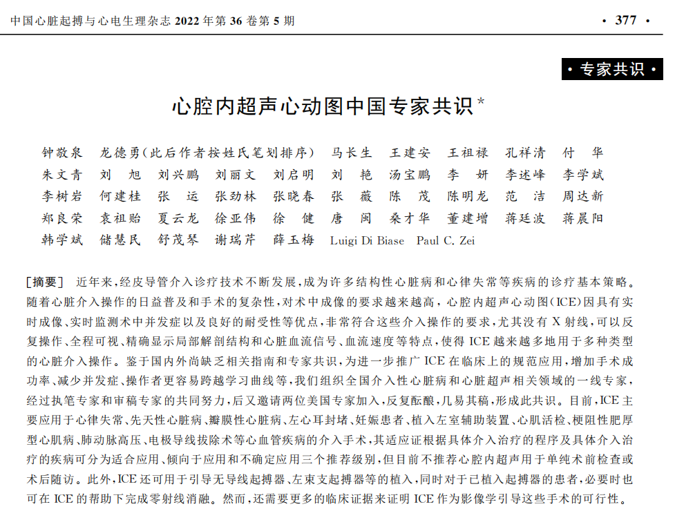 鑒于目前國際上缺乏相關(guān)指南,為促進(jìn)和規(guī)范ICE的臨床應(yīng)用,為臨床醫(yī)生提供指導(dǎo),進(jìn)一步完善心血管介入診斷和治療方案,2022年10月,由國內(nèi)外數(shù)十位頂尖專家學(xué)者編寫完成全球首個(gè)心腔內(nèi)超聲專家共識,聯(lián)合在Frontiers in Cardiovascular Medicine上發(fā)表,推動(dòng)了心腔內(nèi)超聲心血管介入領(lǐng)域的的規(guī)范化應(yīng)用。