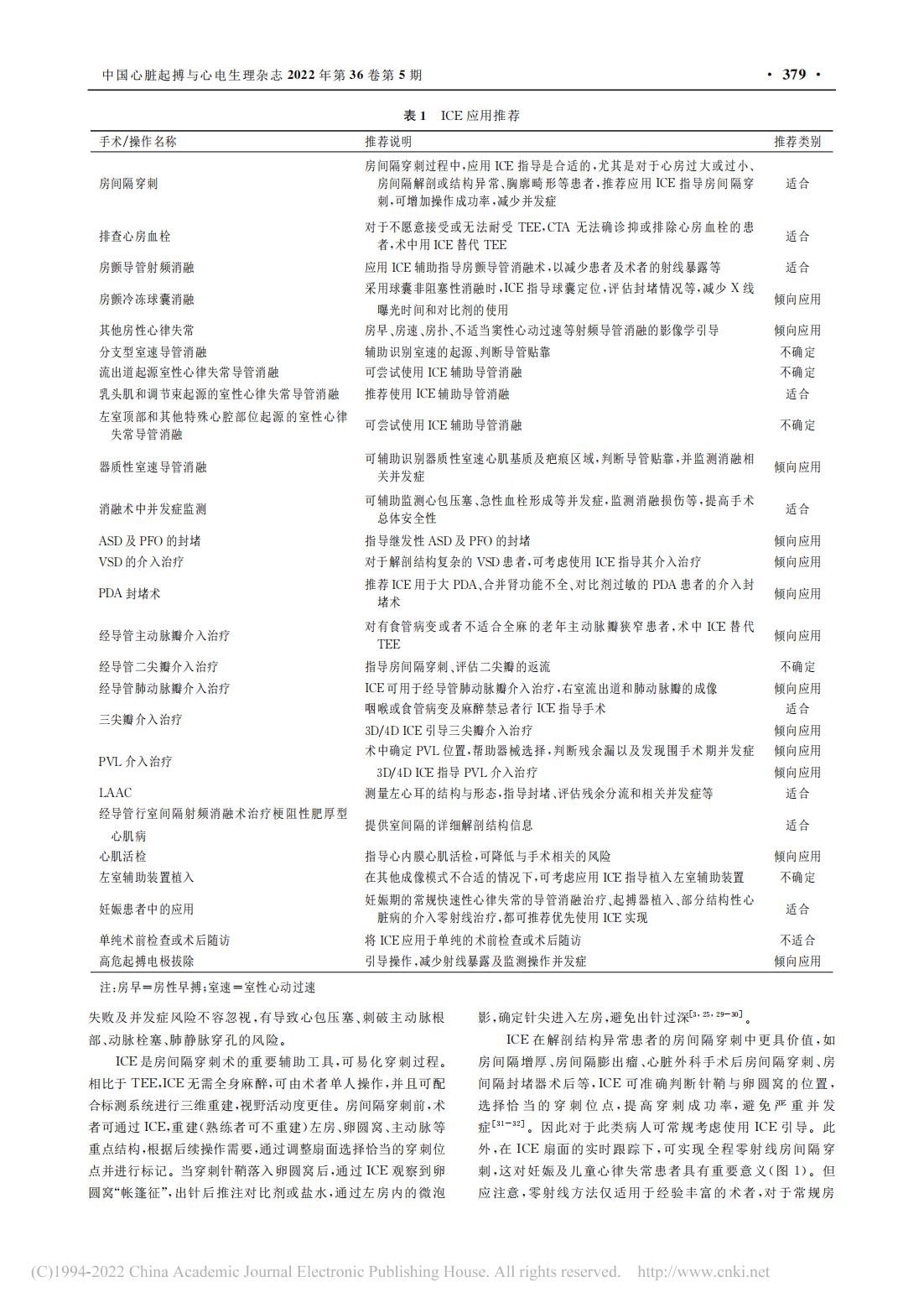 共識指出,ICE最初主要用于指導(dǎo)房間隔缺損(ASD)和卵圓孔未閉(PFO)的介入封堵,其成像效果與經(jīng)食管超聲心動(dòng)圖(TEE)相當(dāng),ICE可對房間隔進(jìn)行成像,明確卵圓窩的位置和解剖結(jié)構(gòu),輔助術(shù)者選擇理想穿刺位置,提高房間隔穿刺的成功率和安全性,現(xiàn)已應(yīng)用于多種需要房間隔穿刺的介入手術(shù),如心房顫動(dòng)射頻導(dǎo)管消融術(shù)、二尖瓣介入治療手術(shù)、左心耳封堵術(shù)(LAAC)等。并且,ICE可顯示食管、動(dòng)脈和心耳等結(jié)構(gòu),從而有望避免相關(guān)并發(fā)癥的發(fā)生,增加術(shù)者信心,減少學(xué)習(xí)曲線,減少并發(fā)癥,增加成功率。