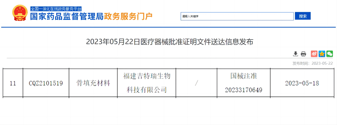 「MA成果發(fā)布」福建吉特瑞·骨填充材料獲證——2023年「第9張」三類醫(yī)療器械注冊(cè)證???MA成果發(fā)布