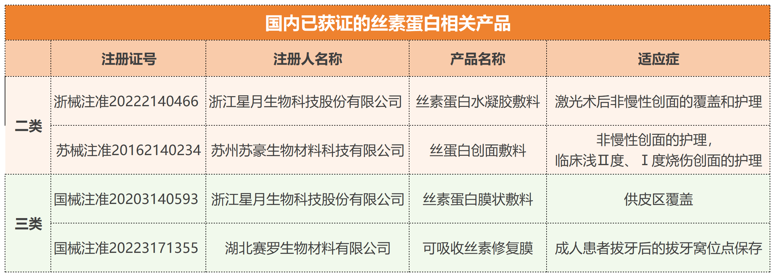 市面已對絲素蛋白制備的做了廣泛探究,目前成功商業(yè)化的產(chǎn)品不多(蠶絲縫合線、SERI外科支架、絲蛋白創(chuàng)面敷料、可吸收手術(shù)修復(fù)膜、Silk Voice®注射劑等),目前國內(nèi)共四款絲素蛋白產(chǎn)品獲批,其中僅一款為可吸收產(chǎn)品,說明市場仍具有巨大發(fā)展?jié)摿Α?/em>