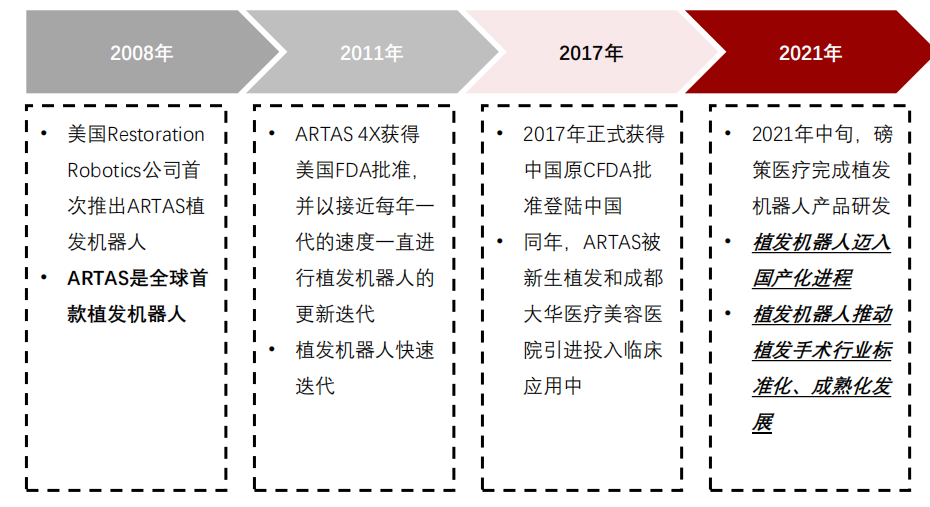 美國Restoration Robotics公司的植發(fā)機器人ARTAS是全球首款植發(fā)機器人,對醫(yī)師來說是個革命性的新工具,2017年被引入中國,陸續(xù)在北京八大處醫(yī)院、復(fù)旦大學(xué)華山醫(yī)院、北京中日友好醫(yī)院等多家醫(yī)院落地。植發(fā)機器人的出現(xiàn)標(biāo)志著智能化FUE時代的到來,植發(fā)機器人的運用,將促進植發(fā)行業(yè)標(biāo)準(zhǔn)化發(fā)展,成功填補中國植發(fā)領(lǐng)域智能技術(shù)的空白。