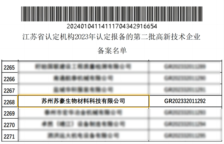 根據(jù)《高新技術企業(yè)認定管理辦法》和《高新技術企業(yè)認定管理工作指引》有關規(guī)定,全國高新技術企業(yè)認定管理工作領導小組辦公室公告了江蘇省認定機構2023年認定報備的第二批高新技術企業(yè)名單,奧泰康蘇州CDMO中心——蘇州蘇豪生物材料科技有限公司榮列其中,獲得江蘇省高新技術企業(yè)認定,這是奧泰康企業(yè)發(fā)展歷程中的重要里程碑。