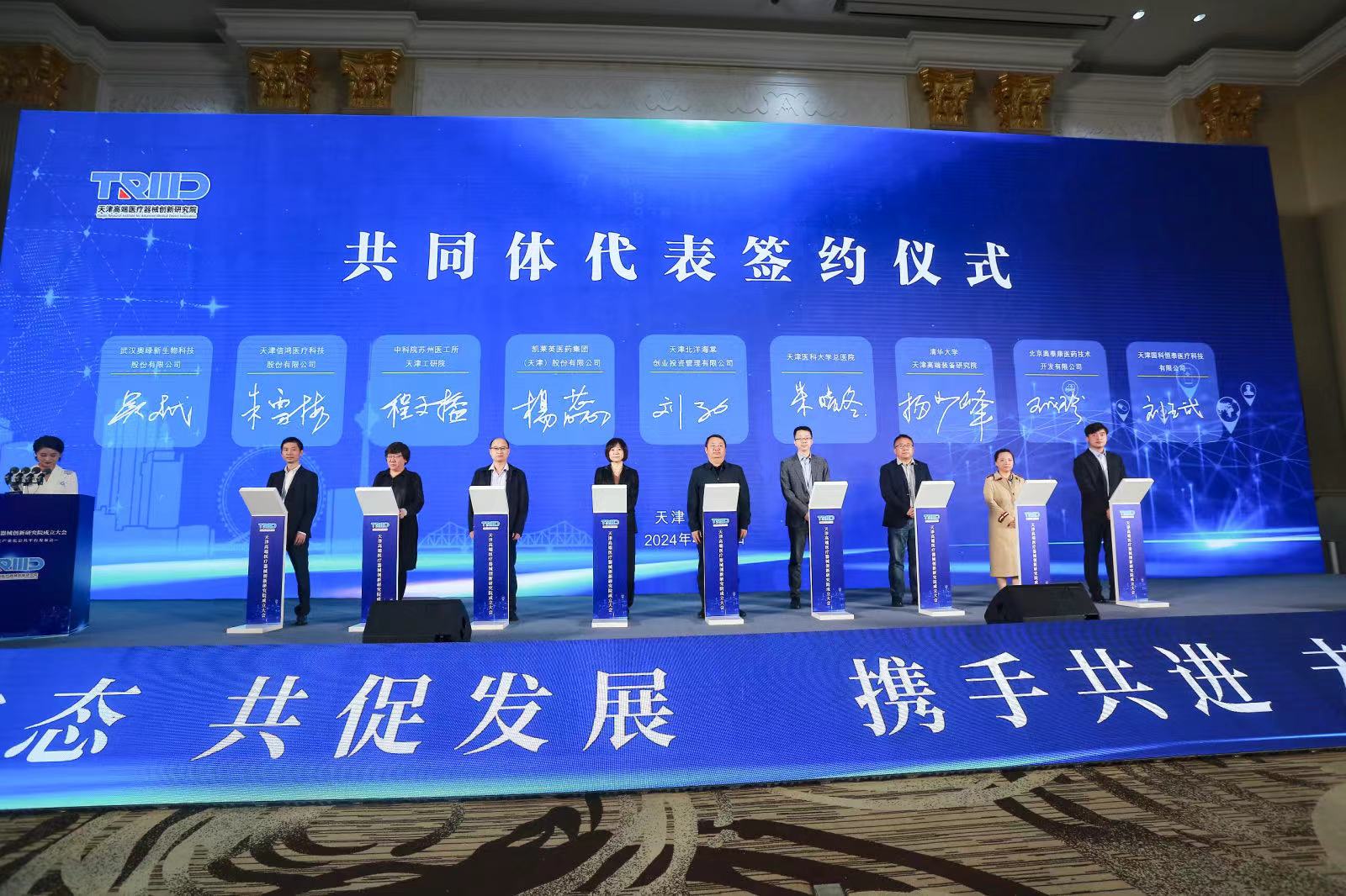 2024年4月24日,由天津市市場監(jiān)督管理委員會、天津市藥監(jiān)局、天津市科技局、天津市衛(wèi)健委、天津市教委、天津市醫(yī)保局和東麗區(qū)區(qū)委區(qū)政府牽頭籌辦的天津高端醫(yī)療器械創(chuàng)新研究院成立大會暨創(chuàng)新轉(zhuǎn)化產(chǎn)業(yè)化公共平臺發(fā)布會于天津順利舉行。奧泰康集團(tuán)副總王成珍女士受邀參加成立大會,并出席天津高端醫(yī)療器械創(chuàng)新研究院共同體代表簽約儀式。