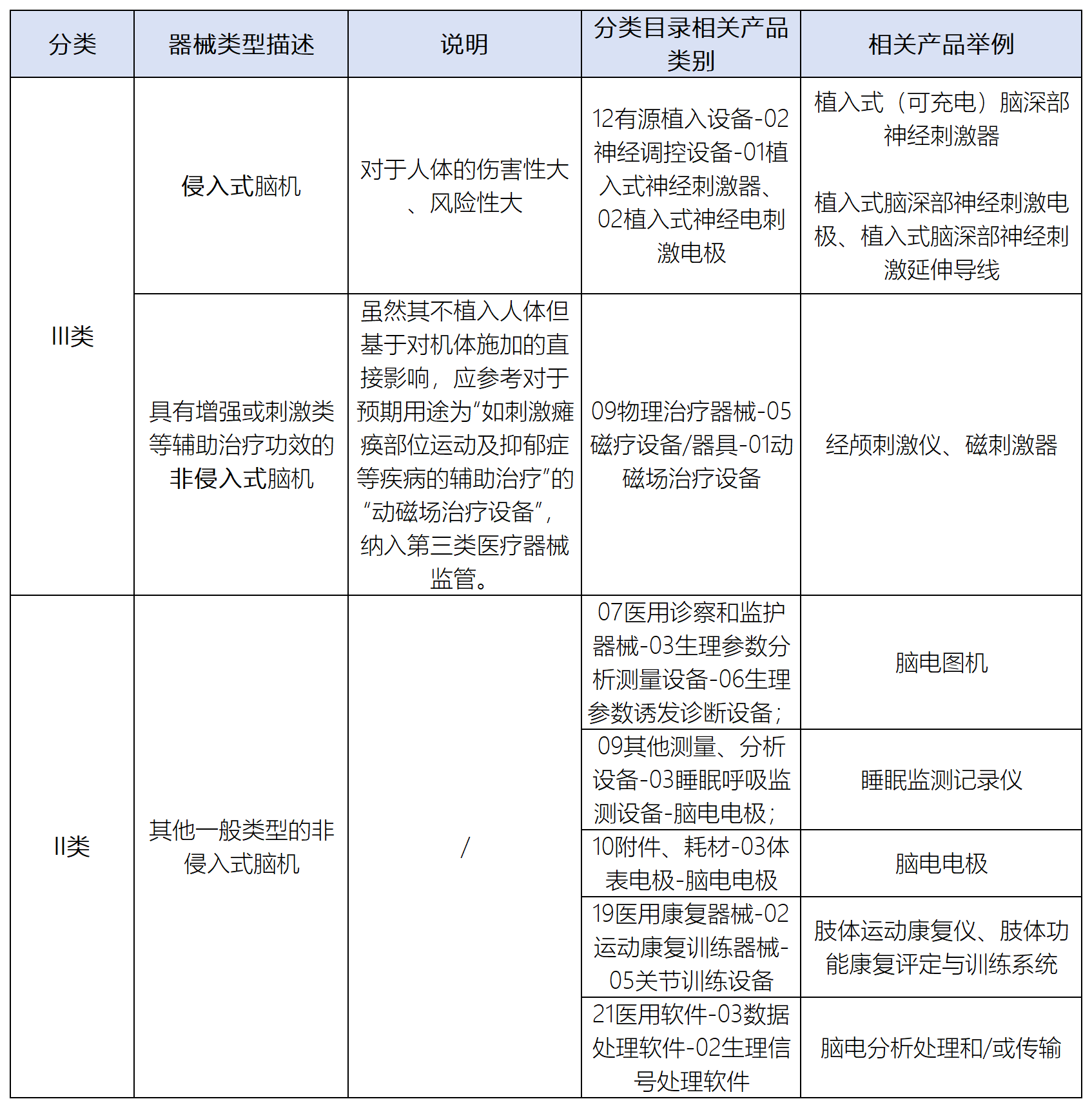 中國器審發(fā)布的《腦機(jī)接口的監(jiān)管現(xiàn)狀》指出,由于III類醫(yī)療器械在注冊難度、監(jiān)管要求、申請受理部門層級和申請時(shí)長等方面都遠(yuǎn)高于II類醫(yī)療器械,我國腦機(jī)企業(yè)目前大多選擇非侵入式采集技術(shù)路線。對于侵入式腦機(jī)設(shè)備,目前都處在臨床性研究和動(dòng)物實(shí)驗(yàn)階段。目前暫無公開性的由國家藥品監(jiān)督管理局正式批準(zhǔn)進(jìn)入人體臨床試驗(yàn)階段的侵入式腦機(jī)器械。根據(jù)廣義BCI的定義,結(jié)合我國現(xiàn)行《醫(yī)療器械分類目錄》的規(guī)定,與BCI相關(guān)設(shè)備的分類主要為II類和III類: