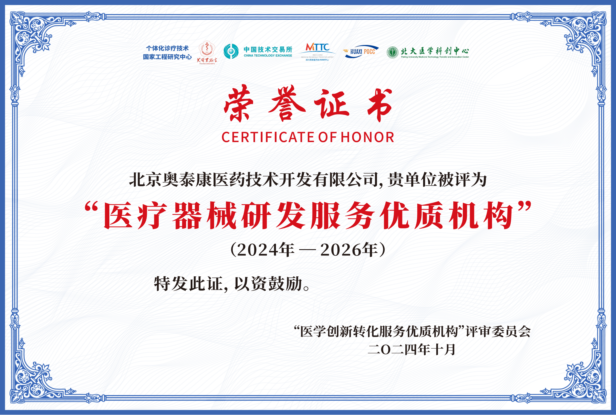 北京奧泰康醫(yī)藥技術開發(fā)有限公司被評為“醫(yī)療器械研發(fā)服務優(yōu)質機構”,集團副總閆江薇女士出席會議并參加榜單發(fā)布儀式。