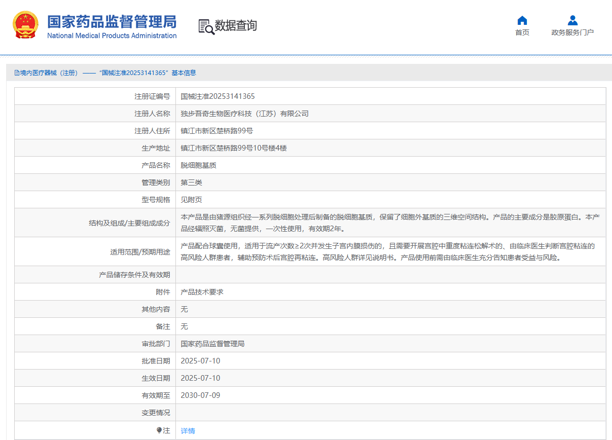 近期,經(jīng)國家藥品監(jiān)督管理局公示,獨步吾奇生物醫(yī)療科技(江蘇)有限公司自主研發(fā)的產(chǎn)品脫細胞基質(zhì)(國械注準20253141365 )獲得NMPA批準上市,奧泰康提供MA解決方案。