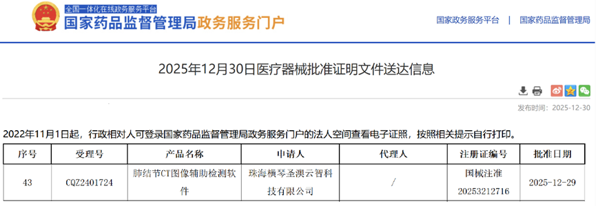 2025年12月31日,經(jīng)國家藥品監(jiān)督管理局公示,珠海橫琴圣澳云智科技有限公司的肺結(jié)節(jié)CT圖像輔助檢測軟件(國械注準 20253212716)獲得NMPA批準上市,奧泰康提供MA解決方案。